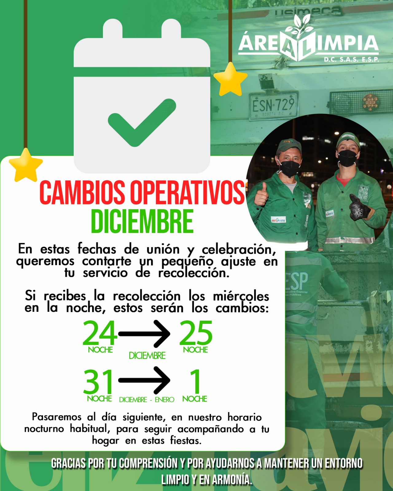 En aras de garantizar el cumplimiento del reglamento técnico operativo para la prestación del servicio público de aseo en la localidad de Suba, informamos a todos los usuarios los ajustes que se implementarán durante el mes de diciembre de 2025, con motivo de las festividades navideñas y de fin de año.